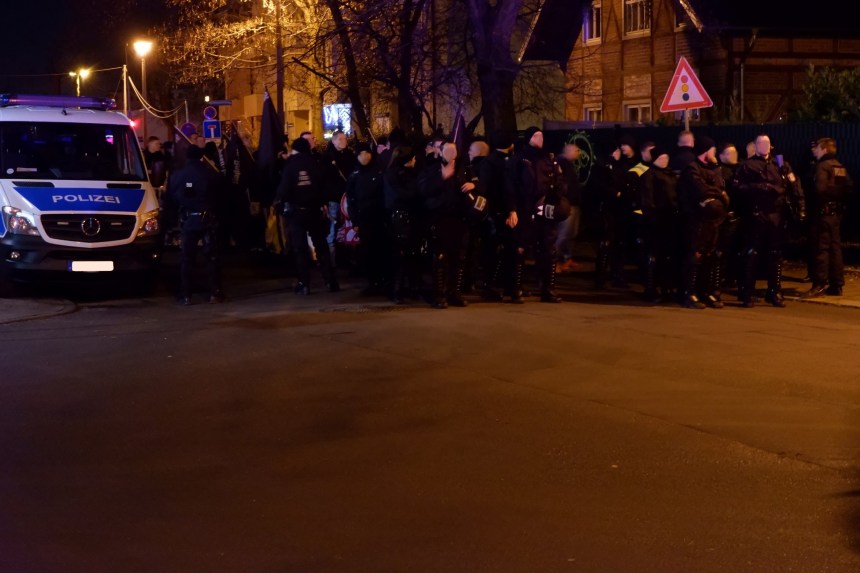 On the Solidary Magdeburg Twitter page, media persons tell their accounts of being attacked by torch marchers on the side, who are then allegedly being guided back into their formation by police.