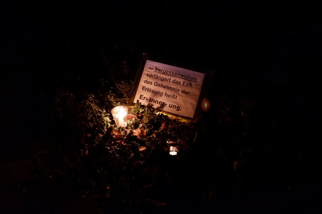 Vigil groups gather at several important locations in Magdeburg to provide symbolic resistance in case the march follows their route. One small group has gathered at the gates of a former concentration camp in Magdeburg-Polke. On the ground, a sign shows a Jewish saying: “Wanting to forget prolongs exile. The secret of salvation is remembrance.”