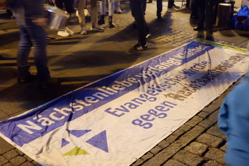 At the main station square, a local evangelical group initiates a vigil with Samba drums. The counter protest arrives, made up of various groups: Fridays for Future, The Left, smaller socialist parties, the Antifa, Bündnis gegen Rechts (Alliance Against Right). The entire protest is said to be approximately 500 strong. Police presence is dense, with swathes guarding a fenced-off pathway leading away from the station entrance. 800 policemen and -women are deployed, drafted from various states around the country. The right-wing march itself is expected to have about 150 attendees.
